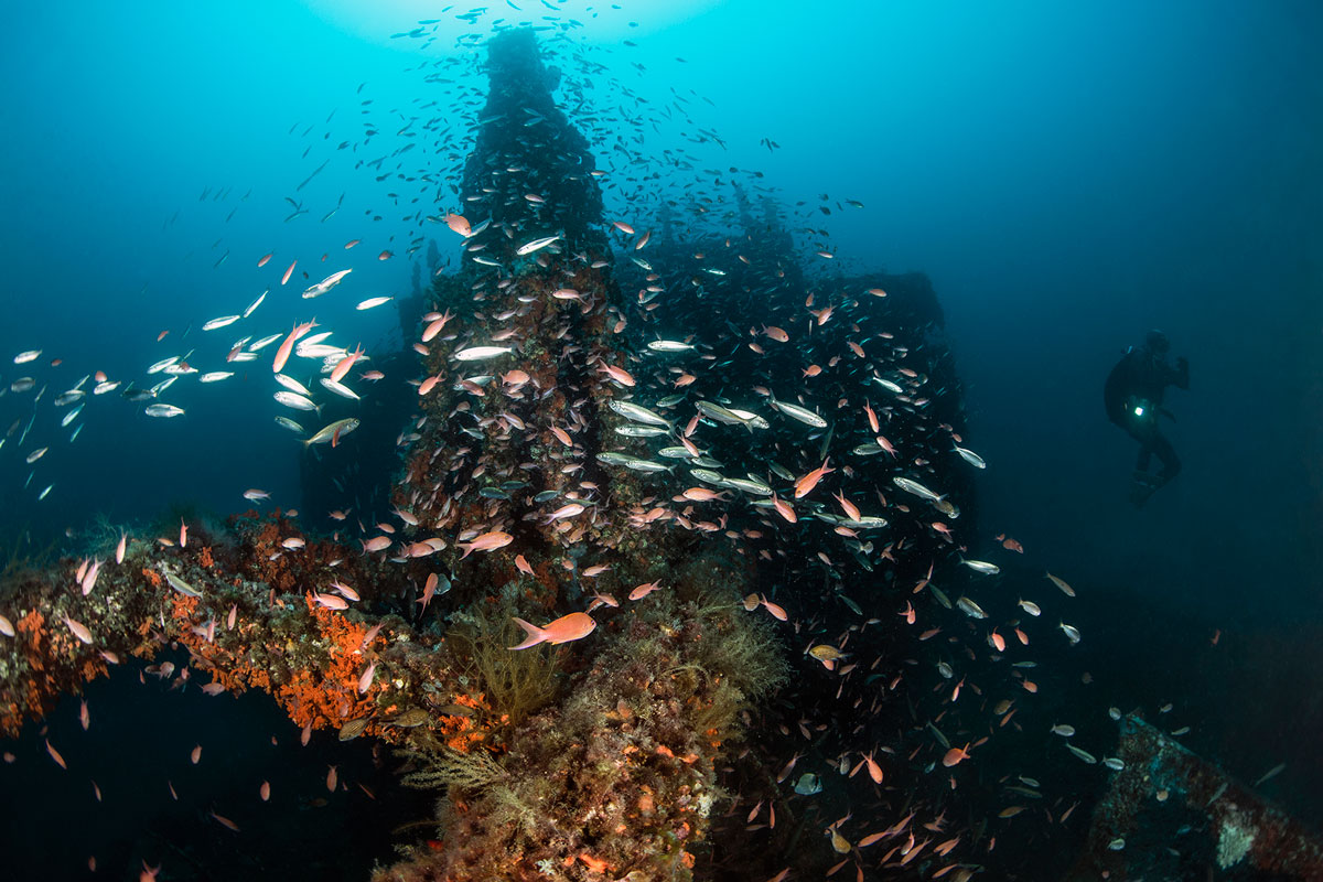 In condizioni ideali la discesa lungo la cima, per l’ottima visibilità, rappresenta di per sé un piccolo tragitto con forti emozioni e già a circa 30 metri si intravede il castello di poppa. La gru di mezzanave ha la sommità a 38 metri e subito la struttura si presenta piena di colori e avvolta da una incredibile nuvola di Anthias.