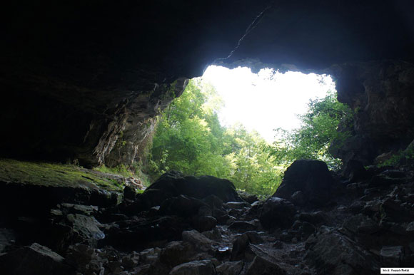 Dopo aver incontrato la figura classica di questo tipo di esperienze (il vecchietto locale a spasso tra i boschi che ci guarda stupito e ci racconta poi di quel veneto – Beppe Minciotti (n.d.a.) – che venne qui per primo vent’anni fa), scendiamo accaldati e ci rechiamo subito alla base dell’alta parete rocciosa per un primo sopralluogo dell’amplissimo ingresso alla risorgenza, che si può effettuare, in estate, dopo aver camminato nel greto del torrente tra i sassi ricoperti di muschio verde marrone.