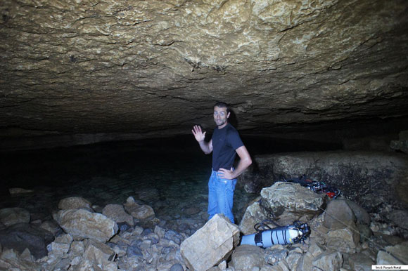 Il corso d’acqua è in secca e non c’è nessun altro speleo-sub. “Bene! – pensiamo, senza comunicarcelo – è proprio quel che volevamo in questo caso…!”.