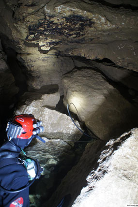 La relativa scarsa profondità non fa valer la pena di un rischioso utilizzo del mio sacro CCR, specie per la tipologia di avanzamento incontrata, fatta di strettoie e di passaggi rasenti la roccia viva.