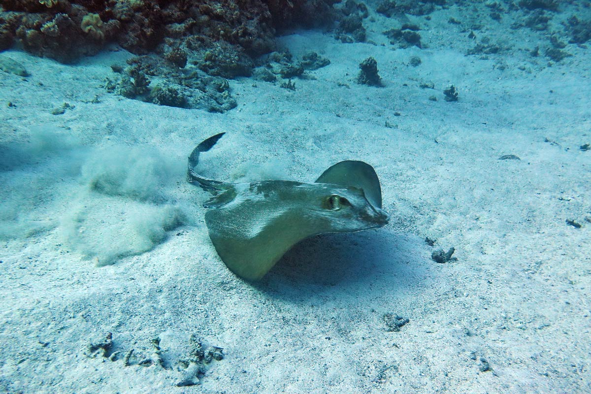 Anche noi risaliamo, a malincuore, ma dobbiamo, i computer ci richiamano all’ordine. E così percorriamo la parete lentamente, dolcemente. Spugne colorate che colonizzano gli alcionari. Gialle, rosse, viola, dalle forme bizzarre. Sembra di essere entrati in un regno incantato, una specie di mondo labirintico fatto di stalagmiti e stalattiti coralline. La barriera è affollata, variegata. Murene, pesci farfalla, pesci pagliaccio vivono in simbiosi con le madrepore. Sono tutti in coppia, si guardano ammiccando con quella intimità che unisce gli amanti. Spirali di barracuda e banchi di carangidi attraversano l’acqua che diventa tremula al loro passaggio. E poi si plana su digradanti pianori arenosi e qui i raiformi si palesano. Razze coda di vacca, trigoni a macchie blu, pastinache lisce prendono il volo in una nebulosa di sabbia che offusca la vista.