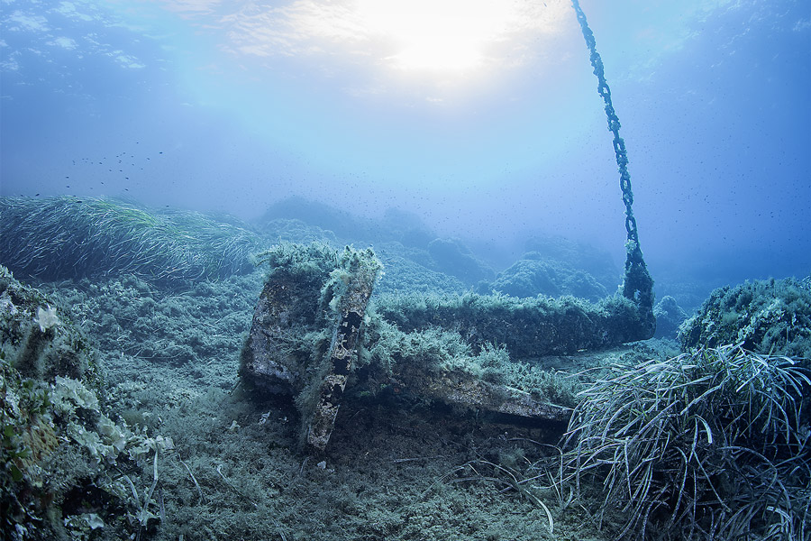 La nostra prima immersione della giornata è alla boa 3 (SP3), considerata la più bella, ricca di pesce, grosse cernie sornione che si lasciano ammirare da vicino, banchi di barracuda, dentici di grosse dimensioni in caccia, corvine, aquile di mare e da un po’ di tempo si possono vedere anche dei pesci pappagallo. Che ha reso famosa questa immersione è anche l’incontro con una cernia soprannominata “Moana” per i suoi comportamenti sfacciati, si avvicina ai subacquei fino a strusciarsi e lasciarsi toccare, cosa ovviamente da non fare per via della mucosa che ricopre il suo corpo e che potrebbe procurargli infezioni da parassiti se dovesse essere rimossa. Arrivati sul punto scendiamo in acqua e ci portiamo a prua, una fastidiosa corrente di superficie ci obbliga a tenerci dalla cima intanto che aspettiamo che si compatti il gruppo e, quando siamo tutti pronti, sgonfiamo i GAV e scendiamo lungo la catena, la quale è fissata ad un ancora gigantesca, utilizzata qui come negli altri punti di immersione dell’isola, come corpo morto per fissare le boe.