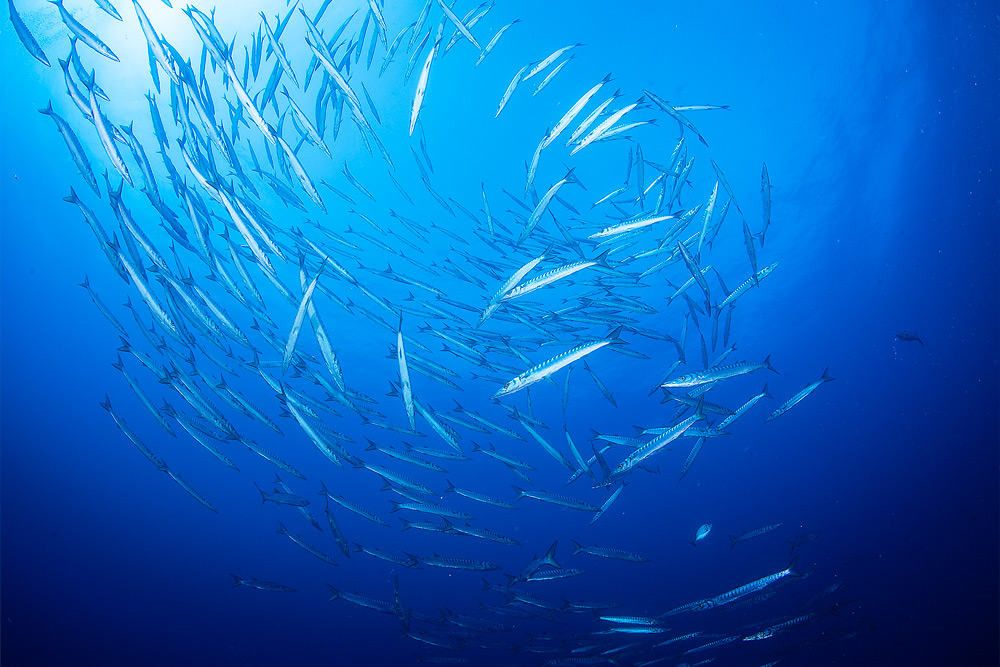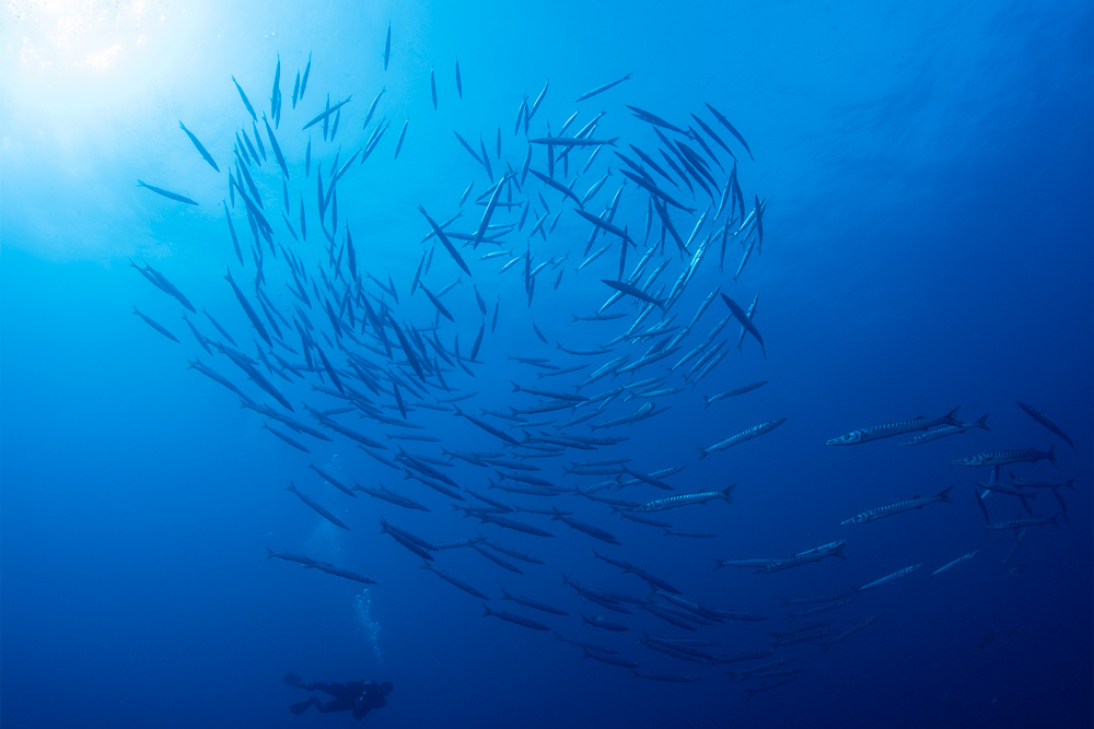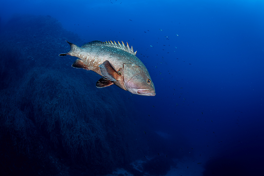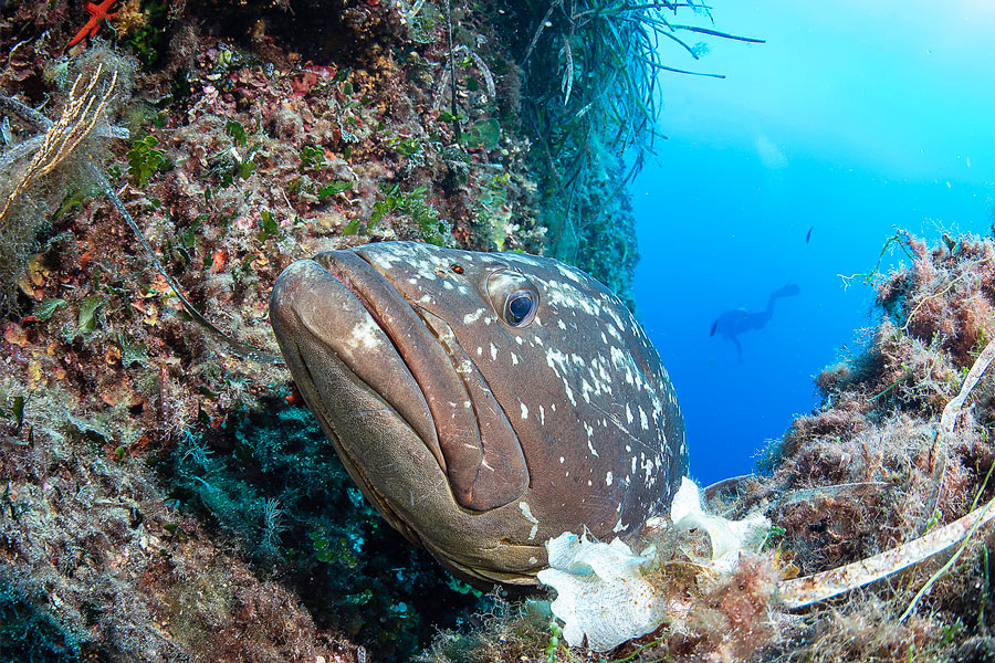 Accendo i flash, sistemo i braccetti, accendo la fotocamera, una Nikon D750 con zoom Nikkor 8-15, in custodia Isotta, è tutto pronto. Ci portiamo sul lato Sud della secca e iniziamo il nostro tragitto seguendo la parete e tenendola alla nostra sinistra, subito nel blu un grosso banco di barracuda, Sphyraena sphyraena, che forma la caratteristica “palla”, nuotiamo in mezzo a loro e ne veniamo avvolti, sono veramente numerosi. Proseguendo il nostro percorso incontriamo diverse cernie, Epinephelus marginatus, abituate ormai ai subacquei si lasciano avvicinare e fotografare come dive. Arriviamo da Moana, sembra aspettarci, è una vera star, si mette di profilo, si specchia nell’oblò della custodia, si allontana un po’, poi ritorna, è proprio affascinante. Gli occhi puntati verso il blu, sperando di avvistare le aquile di mare che in questo sito sono una presenza costante, intanto sfrecciano davanti a noi dentici e ricciole, è un vero paradiso!