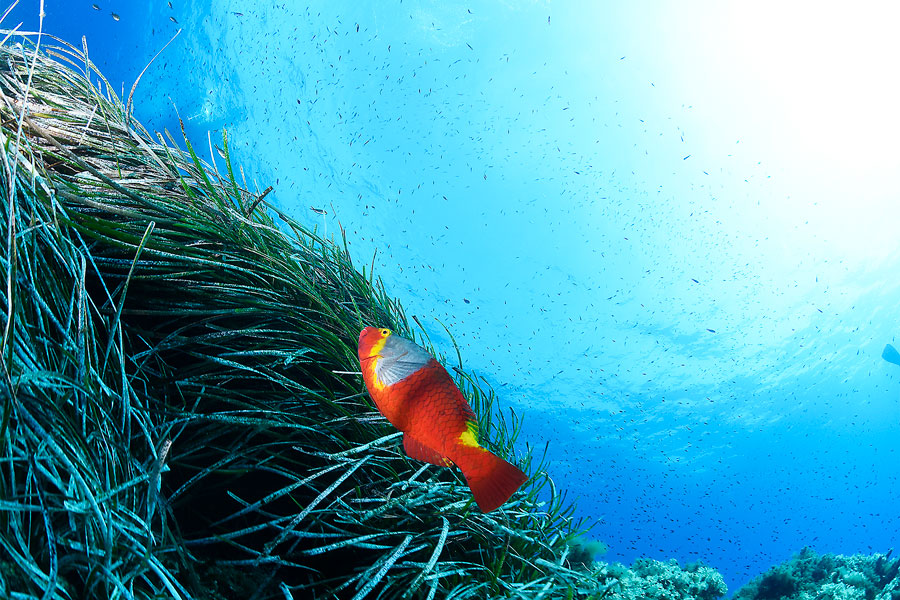 Terminato il nostro tragitto di andata, ruotiamo di 180 gradi e ritorniamo verso il gommone, ancora cernie, barracuda, dentici… Vengo attirato da un pesce coloratissimo, mi avvicino e vedo un pesce pappagallo mediterraneo femmina, Sparisoma cretese, chiamato anche Scaro, la livrea della femmina è molto appariscente, di un rosso vivo con chiazze gialle sul capo e sul peduncolo caudale. Terminiamo l’immersione sotto il gommone con la sosta di sicurezza di 3 minuti. Saliti sul gommone sostituiamo subito le bombole, aiutati dallo staff e ci spostiamo sulla boa successiva, per noi oggi è la SP2, proprio di fronte al paese di Pianosa. Sosta di un’oretta gustando focacce, qualche dolcetto, scambiando ovviamente pareri su quanto visto in acqua e ascoltando il briefing per il secondo tuffo. Anche questo sito è molto caratteristico, una serie di scogli che svettano sopra una prateria di posidonia e una bella parete, sempre tante cernie, corvine, dentici e qualche barracuda. A fine immersione ci troviamo su un pianoro di roccia, dove si apre una stretta spaccatura, nella quale ci infiliamo uno per volta, per ritrovarci in una spaziosa camera dove la luce che penetra dalle fessure crea degli scenari molto suggestivi.
