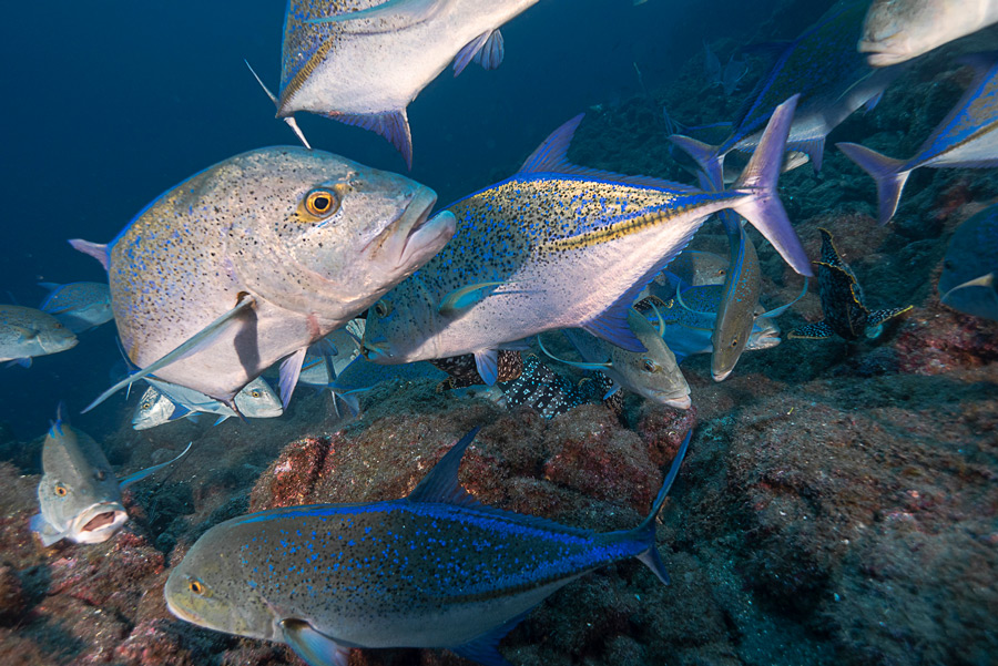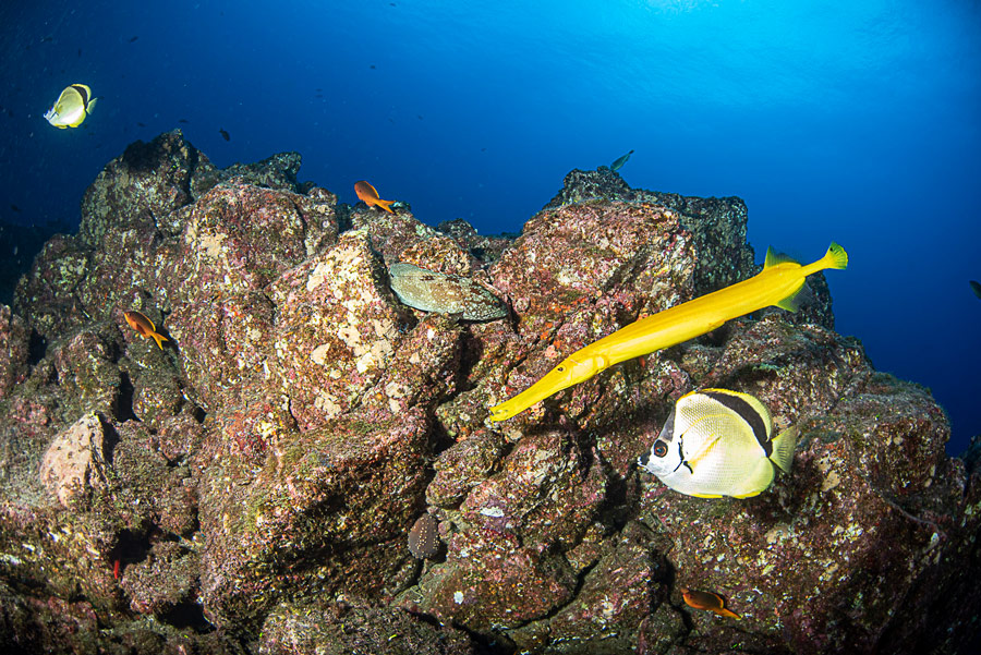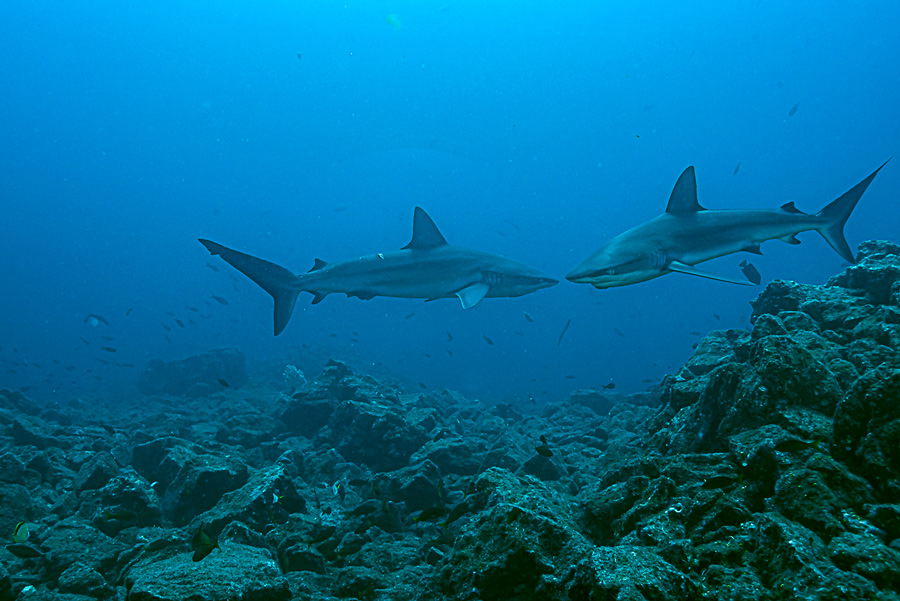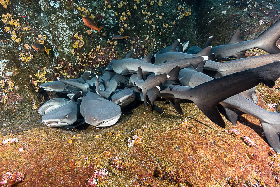 Sott’acqua lo scenario è impressionante e osservare le nude pareti prive di coralli e vegetazione che si perdono nel buio dell’abisso è un’esperienza che toglie il fiato. C’è pesce ovunque, dalle profondità fino in superficie, da quello di piccola taglia ai grandi banchi di carangidi oltre a una moltitudine di squali pinna bianca spesso ammassati pigramente sulle terrazze scavate nella roccia. Poco più distanti alcuni esemplari di grigi e galapagos gironzolano attorno al faraglione, mentre nel blu si intravedono grossi tonni e densi banchi di pesce azzurro.