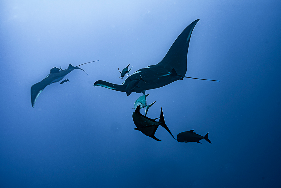Sott’acqua il fondale è dominato da ampie aree sabbiose interrotte da intricati canyon e banchi rocciosi. Ovunque si osserva una moltitudine di pesci di barriera, carangidi, pinnabianca, aragoste, murene, pesci pappagallo, farfalla, pesci palla, trombetta e varia minutaglia, ma l’interesse maggiore è dato dalla presenza di alcune cleaning station, regno incontrastato delle regine di Revillagigedo. Le mante giganti del pacifico, creature maestose con aperture alari di oltre 6 metri, non si fanno attendere e sopraggiungono in coppia lentamente ipnotizzando nostri sguardi con movenze lascive e civettuole, planando sopra i nostri corpi in un gioco che vorremmo non finisse mai.