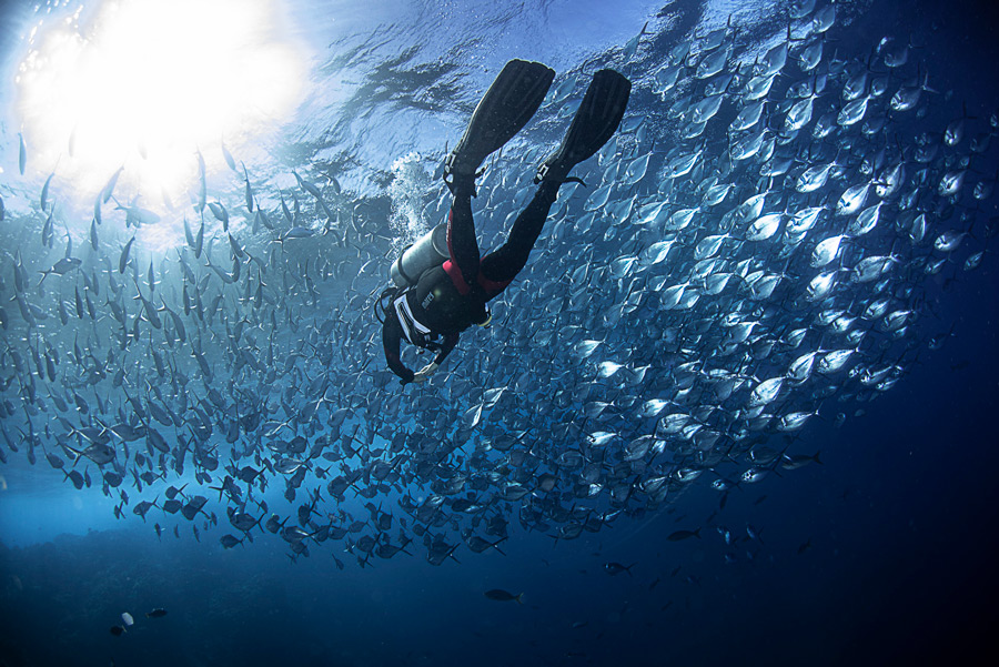 Infatti, quando le condizioni di corrente sono favorevoli la quantità di pesce è a dir poco entusiasmante. Questo è il regno di squali martello, mante, delfini, balene e la morfologia dei fondali, caratterizzati da massi ciclopici che dalle batimetriche superficiali scendono vertiginosamente nel blu profondo, ne sono la dimostrazione. Purtroppo oggi di corrente non c’è traccia, né tantomeno di carcarinidi e altri predatori letteralmente scomparsi. Solo la terza immersione ripaga in parte della delusione, grazie alla presenza quasi costante delle mante, qualche tonno taglia extra e un piccolo gruppo di delfini che, sul finire dell’immersione, ci restituisce sorriso e positività restandoci accanto con indimenticabili evoluzioni.