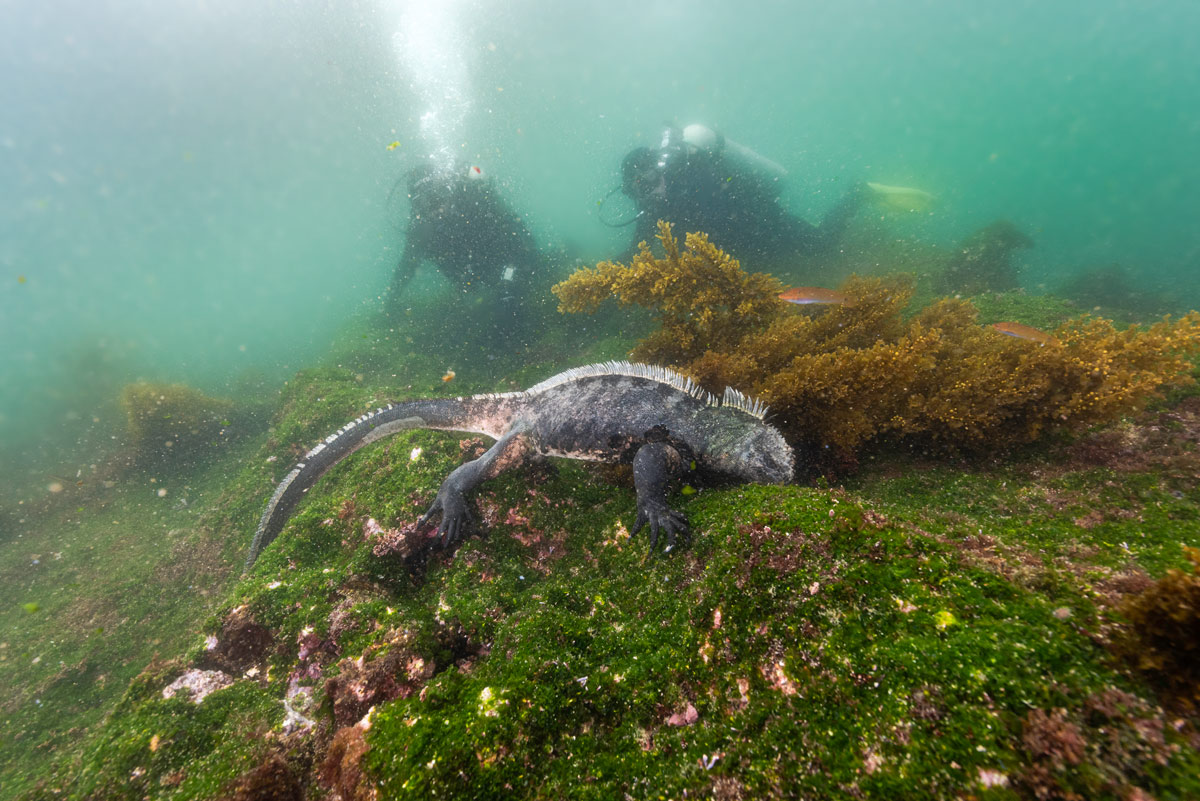 Il viaggio prosegue verso l’isola di Fernandina, dove ci attende una sfida imprevista: l’acqua scende fino a 14-15 gradi a Cabo Douglas, e molti del gruppo devono risalire per ipotermia. Ci avviciniamo alla costa e in pochi minuti il paesaggio subacqueo si trasforma. Le acque fredde, ora più sopportabili, ospitano creature uniche: tartarughe, otarie, gorgonie e spugne policrome, e poi le straordinarie iguane marine, che si nutrono sul fondo in un balletto lento e preistorico. È un’immersione diversa, più naturalistica, che ci regala emozioni autentiche.