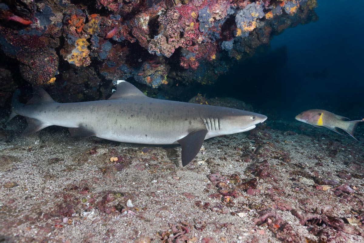 Il giorno seguente replichiamo le immersioni a Darwin: quattro tuffi carichi di aspettative, e ancora una volta i carcarinidi rispondono presenti. Ma la sorpresa arriva su un pianoro sabbioso, dove li avvistiamo numerosi in profondità, più chiari, più vicini. Il loro passaggio silenzioso e sinuoso è poesia pura.