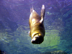 Ci buttiamo. Siamo più o meno a 4m. Mi ritrovo in mezzo a un branco di sub che agitano chi le pinne chi le braccia per invitare i cuccioli a giocare con loro. Nel mentre io pascolo lì intorno ma a un certo punto vedo un’ombra sopra me: è un cucciolo a cui piaccio particolarmente. Dopo aver provato invano ad addentare le mie pinne mi gironzola attorno e alla fine si posiziona sulla mia bombola… so che c’è ma non riesco a vederlo. Decido di allontanarmi ma lui mi segue e a un certo punto mi addenta una spalla: spaventata da questa leggera pressione mi scosto con impeto e i suoi denti mi fanno un pochino male ma nulla di che: la mia fuga continua e a quel punto alzo gli occhi e capisco di essere al centro dell’attenzione di tutti i sub che prima si sbracciavano… alcuni mi indicano di stare calma… perchè??? Non sono mica agitata J ho solo un cucciolo (i cui canini sono paragonabili a quelli di un dobberman…..) che mi insegue e attenta alle mie pinne! Per fortuna si stufa e a un certo punto mi lascia in pace. Bobbysub in tutto questo è rimasto a filmarmi divertito…