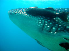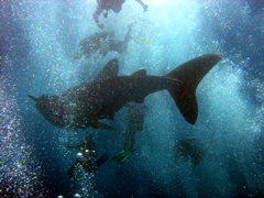 Sono un pò stanca e quindi passati circa 40 minuti decido di risalire lasciando Bobbysub con gli altri (lui va avanti fino a esaurimento bombole se glielo consentono… ). Sono a 4 m a finire la sosta di sicurezza attaccata alla corda, quando dalla mia sinistra vedo un’ombra enorme che elegantemente si avvicina: non posso credere ai miei occhi!!! E’ uno squalo balena lungo almeno 6 metri! Mamma che emozione, meno male che sono a 4m perchè il cuore ha preso ad andare all’impazzata e respiro come un mantice… Penso che Bobbysub è rimasto sotto e magari il balena potrebbe passargli sopra e lui non accorgersene…. devo assolutamente andare ad avvisarlo e quindi mi ricaccio subito giù. In un batter d’occhio sono a 11 metri e lo cerco. Tutti i sub si sono accorti di questa presenza e i computer bippano all’impazzata (in certi momenti è davvero molto difficile ricordarsi di salire piano!!!) Trovo Bobbysub ma anche lui si era già accorto dell’enorme animale (i bip dei computer lo avevano messo sull’erta che qualcosa di particolare stava succedendo). E’ meraviglioso. Purtroppo l’immersione è finita, dobbiamo uscire. Appena in barca molti si preparano a ributtarsi in acqua per fare snorkeling e ammirare ancora questo animale sensazionale e così difficile da incontrare. Bobbysub è in prima fila naturalmente. Il balena continua a rimanere vicino alla barca e anche dalla superficie è possibile avvistarlo. Attendiamo un’oretta e lui è sempre lì!!!! Viene chiamata via radio anche un’altra barca che subito si precipita. Siamo pronti per la terza immersione. Tutti in acqua armati di macchine fotografiche e quant’altro!