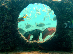 I giorni a seguire proseguono con queste piacevoli gite in barca. In uno di questi andiamo a “El Bajo”: si tratta di una montagna sommersa la cui punta sta 20 m sotto la superficie del mare. La costa si vede ma è davvero lontanissima. Fa una certa impressione immergersi in mare aperto. Questo punto è famoso perchè qui “abita” un branco di squali martello ma data la temperatura dell’acqua (circa 30°C) sarà davvero improbabile vederli. I mesi migliori sono febbraio-marzo (tanto per cambiare siamo nel posto giusto al momento sbagliato) ma in quei mesi spesso c’è mare e pertanto non sempre si riesce a raggiungere questo punto di immersione che non offre alcun riparo. Ci immergiamo. Devo dire che questa è una immersione stupenda sebbene non facciamo alcun incontro particolare. Io non sono molto amante delle murene e di solito non le fotografo nemmeno, ma qui… qui ce ne sono in quantità incredibile! Sono grandi murene verdi e in ogni spaccatura della roccia ve ne sono 4 o 5 o 6 o anche più! Insomma più che tane sembrano condomini! Il cappello però offre anche tante altre forme di vita ed è davvero piacevole fare questa passeggiata subaquea. Nella immersione successiva ci spingiamo un pò più giù, andiamo nel blu, ma di nuovo non vediamo nè squali nè grosso pesce pelagico.
