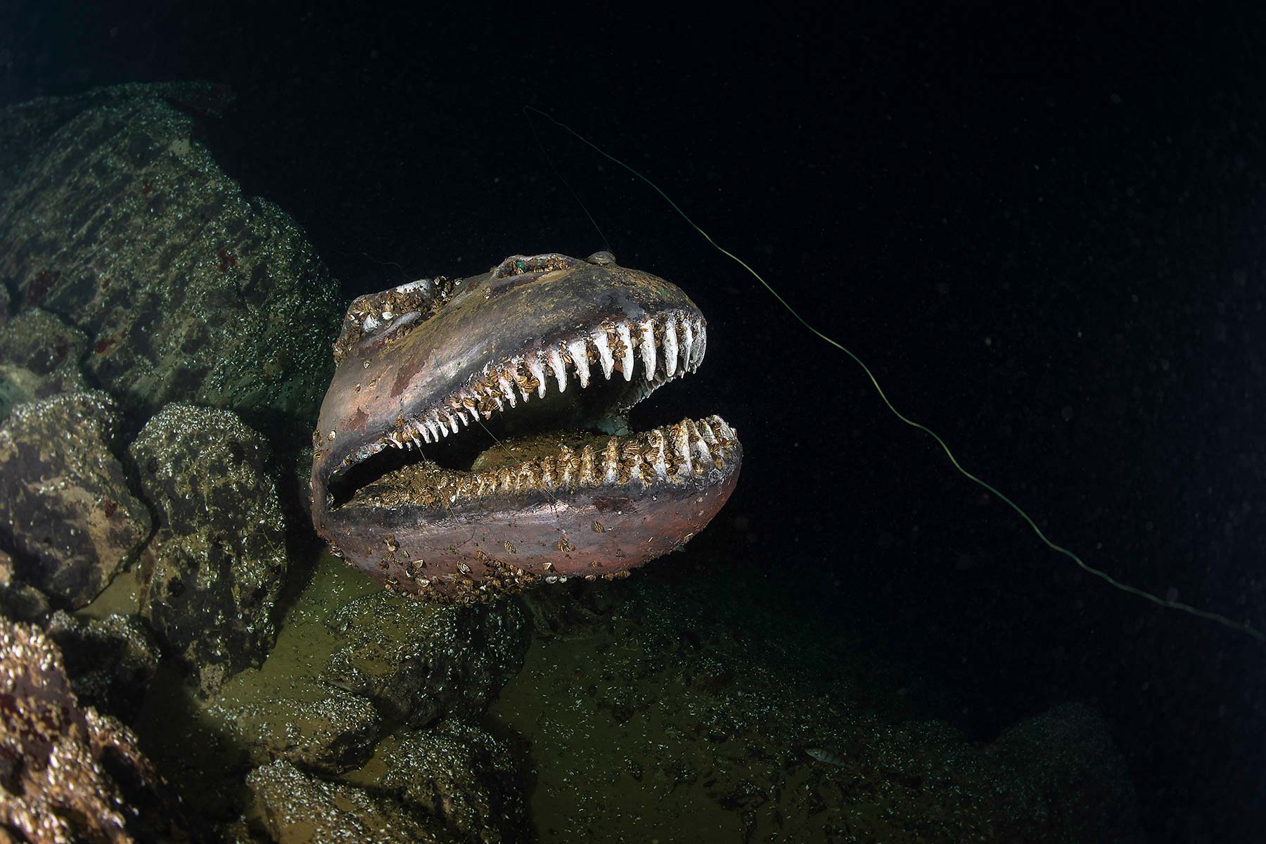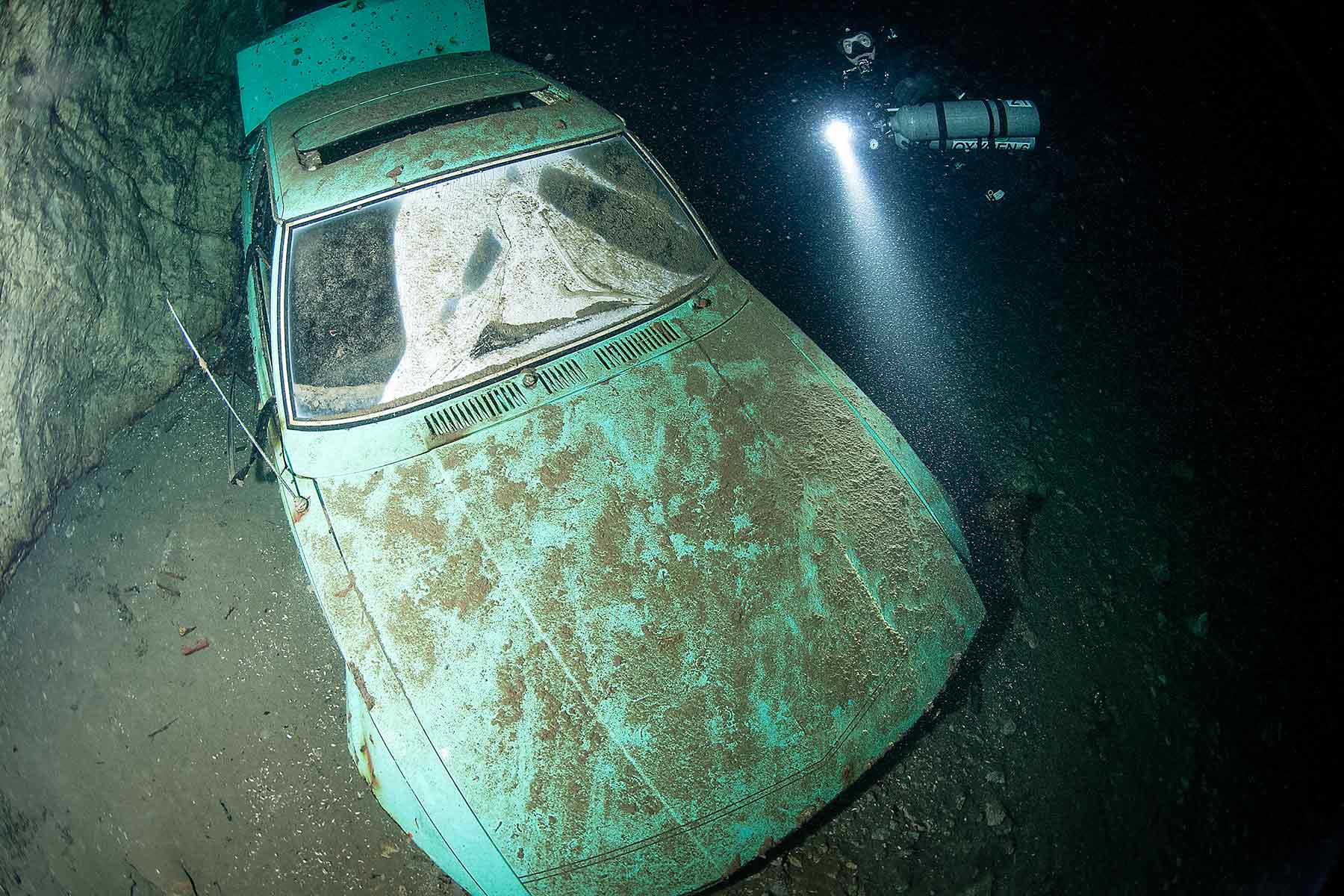 La prima auto appare a -60 metri di profondità: una Lancia Thema bianca, con il baule aperto, sembra sospesa in bilico sul bordo della parete. Grossi massoni le impediscono di rotolare nel vuoto sottostante. L’ambiente è avvolto nell’oscurità; l’unica luce proviene dalle nostre torce, che illuminano i dettagli di questo relitto sommerso. Ci giriamo intorno più volte, catturando immagini con la mia Nikon D750, in custodia Isotta.