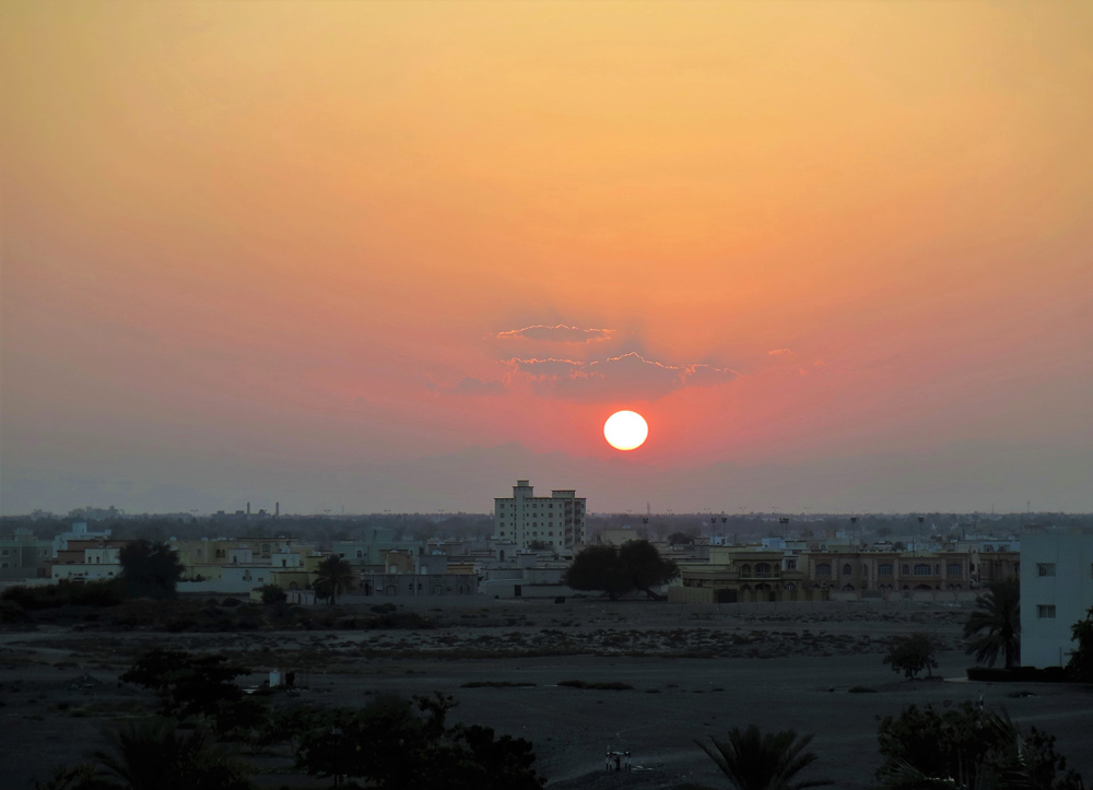 Raggiungo il Millenium Resort, in località Mussanah, che albeggia. Un tepore dalle sfumature del rosa antico avvolge questa cattedrale nel deserto. Il resort si erge maestoso in mezzo al nulla e circonda la baia con la sua tipica forma a ferro di cavallo. Alla reception un uomo, appena destato dal mio arrivo, mi assegna la camera, grande, lussuosa, affacciata sul versante interno. Non ho la visuale sul Golfo dell’Oman, ma dal mio balcone mi ritrovo tutti i pomeriggi alle cinque ad ammirare i tramonti omaniti, con la palla rossa del sole che lambisce la torre del minareto per poi adagiarsi sulla linea dell’orizzonte e confondersi con le luci che brillano tremule sulle rare case del villaggio. Un presepe mediorientale, se mai una tradizione così sia in qualche caso esistita in Medio Oriente.