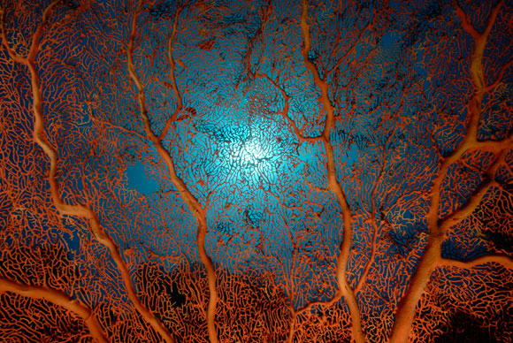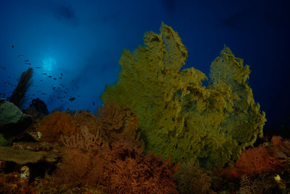 Ventagli di gorgonie arancioni crescono rigogliosi lungo le