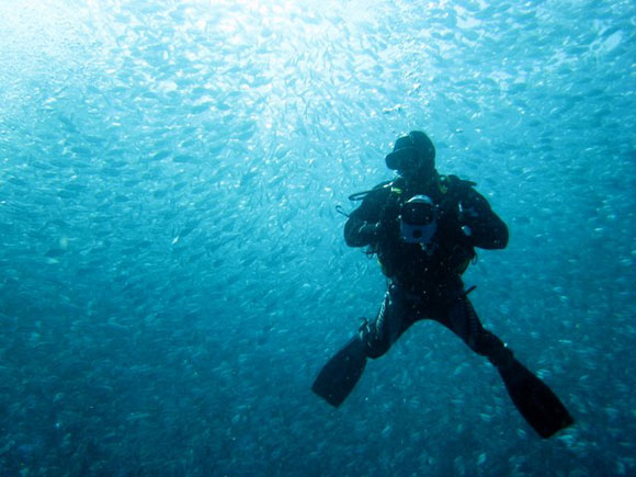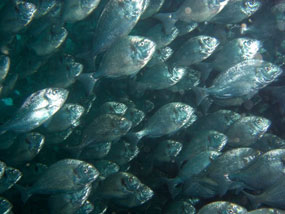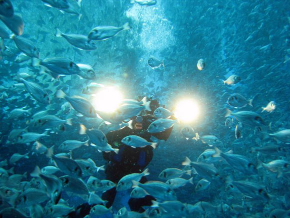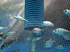 Le immersioni sono sempre semplici (se non lavori!), condotte a profondità variabile tra 0 e 15 metri: si potranno ammirare le vasche delle orate e dei branzini da dentro e da fuori, il sistema di fissaggio al fondale e alle boe con le cime ricoperte di cozze, le strutture galleggianti. In questo periodo è anche possibile guardare (da fuori) le vasche degli avannotti (i piccolini), che sembrano tante monetine dorate e argentate.