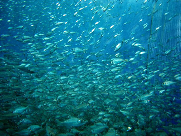All’interno delle reti ci sono strani effetti ottici: sembra che il mondo ti ruoti intorno, insieme alle orate e ai branzini…la vista si arricchisce di riflessi argentati. Il sole filtra dall’alto tra i pesci.
