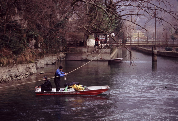 Eseguendo i nodi di rito, mi accorgo che alcuni protei, 4 o 5, mi stanno facendo compagnia: le mie intenzioni sono amichevoli ma turbo il loro tran-tran quotidiano cosicchè seccati, pur stando a mollo in acqua, nascondono la testolina tra i massi e i buchi del fondo: anche per oggi nessun invito al tea-party. Finalmente riconosco il punto dove avevo fissato il filo l’ultima volta: rifletto su come è si è modificata la mia progressione in questo tratto rispetto all’anno scorso; con il circuito aperto ero arrivato qui e come un fulmine avevo fatto dietro-front saltando il minimo di deco che mi toccava. Adesso, con il circuito chiuso, ho tutto il tempo di guardarmi in giro, vedere altre gallerie, volteggiare da un lato all’altro. Mi aggiro con circospezione tra un masso e l’altro, perché per un momento mi è sembrato, osservando la sospensione, di avere la corrente dietro la schiena: dopo 32m, di fronte a me, incrociando un’altra galleria, vedo un filo di piccole dimensioni ancora bianco: accidenti! lo riconosco! E’ lo stesso filo che ho visto sulle bobine di Rick Stanton questa estate in Francia. Non credo ai miei occhi, perchè non avrei mai immaginato di poter arrivare a congiungere le due gallerie di Oliero. Da ora in poi non saranno solo i Protei ad entrare dai Siori e uscire dai Veci o viceversa! Dopo aver fissato il filo nei pressi dell’altro, ritengo che sia ora di rientrare: sono a conoscenza del percorso della galleria esplorata da Rick. Ho tutto il tempo di osservare sul computer che sono passati 115′. Pinneggiando, pinneggiando verso il ritorno, raggiungo il maialino che grazie alla sua spinta mi fa avanzare con più velocità e senza fatica fino a dove giace il maiale grosso. Riallestisco il sistema di traino poi, sorridendo nella maschera, accarezzo l’immagine delle future esplorazioni, dei percorsi sorprendenti e senza quasi accorgermi raggiungo la bombola da 20l che recupero e trasporto fino al bivio a 1250m; lì mi servirà come soccorso per le prossime escursioni. Trascorsi 190′ la prima quota deco è a -42m in compagnia di tre piccoli protei; dopo decina di minuti appare la scura sagoma di Jean Jacques che passa e va dopo un segnale di ok. Via via sono visitato da Marc, Roger, Christos, che tra una foto e una borraccia di thè allietano la mia sosta, mentre Simone in ottima forma e Ennio K.O. per l’influenza, fanno le balie asciutte occupandosi della parte logistica. Esco nel mondo dell’aria alle 17h20’ dopo 290′ e tante facce e curiose mi stanno intorno, compreso l’occhio vitreo della telecamera di una TV locale.