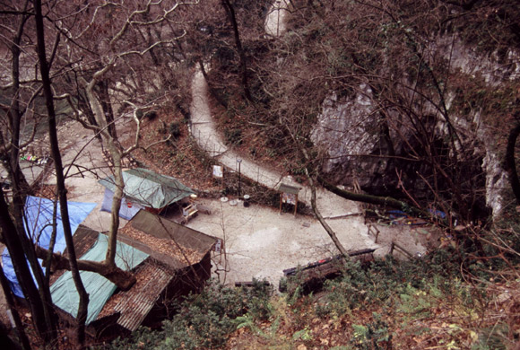 Sabato il gruppo è ridiventato numeroso ed ognuno fa la sua parte; Cichita, Cimabue, Ennio e Christos posizionano la campana e tutti gli accessori in acqua, io mi dedico a sistemare gli ultimi aggeggi che mi serviranno domani e Jean Jacques prepara il suo circuito semichiuso. Nel pomeriggio siamo raggiunti da Marc… e Roger…i due amici Belgi che stanno facendo la topografia all’Elefante Bianco fino alla profondità di -105m. Marc si immerge per portare oltre il laminatoio un maialino e una bombola da 20l.