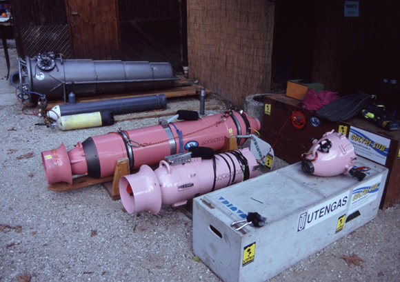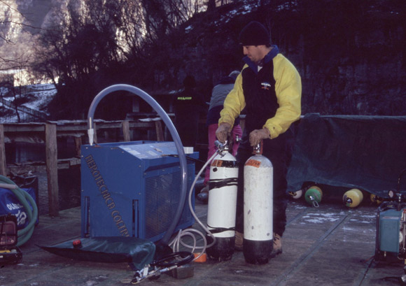 La domenica, tutta la linea decompressiva viene messa in acqua, comprese due bombole da 20l e una da 15l, più uno svolgisagola con 500m di filo, che vengono posizionati al di là del laminatoio, pronti per essere presi da me e portati in punti prestabiliti.