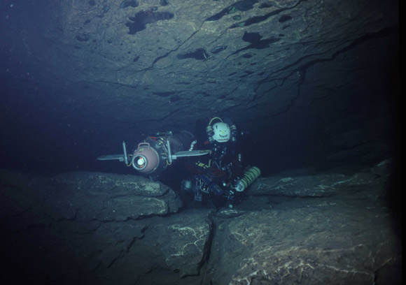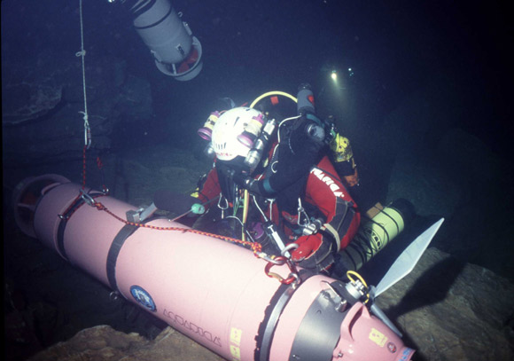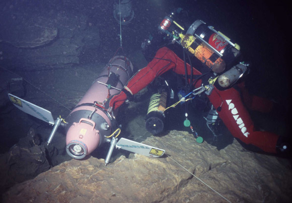 Dopo qualche inconveniente iniziale, il mio sottomuta bagnato dal solito Cimabue risalito grondante sulla barca comune, quando sono circa le 12.30 mi avvio per provare la continuazione nella parte fossile della grotta. Splash! giù in acqua, supero rapidamente il laminatoio al di là del quale oziano il maiale grosso, un aquazepp, il maiale rosa piccolo, due bombole da 20l e uno svolgisagola. Riesco a tenere attaccati dietro a rimorchio, due maialini e una bombola da 20l. La progressione è rapida come sempre; il faro nuovo che ho montato sul maiale non si rivela di appropriata utilità perché illumina di fronte a me e non il filo che sta sotto di me; lo modificherò inclinandolo verso il basso. Raggiungo i 1250m, lascio l’aquazepp di soccorso e proseguo il mio viaggio. Dopo 65′ raggiungo e supero senza troppi problemi la bombola che avevo posizionato due giorni prima ed a circa 1850m dall’ingresso, ritrovo il filo rotto che mi costringe a fermarmi. Parcheggio i maiali e tranquillamente, pinneggiando, stendo 30m di filo nuovo fino a raggiungere il filo vecchio. Ritorno ai maiali e dopo aver riordinato tutto, continuo la progressione. Il vecchio filo non ha un bell’aspetto: si presenta con disgustoso colorino marrone, mostra, in alcuni punti, evidenti segni di usura e non è sempre rimasto ben teso. Le macchine come la mia, i circuiti chiusi, sono la fine del mondo per quanto riguarda l’autonomia, ma non devo cadere nell’errore di essere troppo fiducioso per quanto riguarda i termini di sicurezza, perciò, con cautela passo, a distanza dal filo evitando di strattonarlo inavvertitamente.