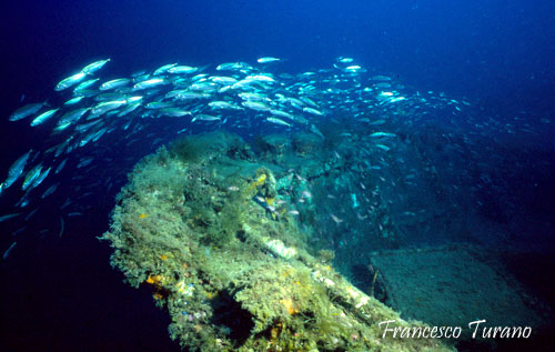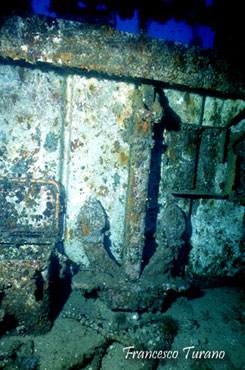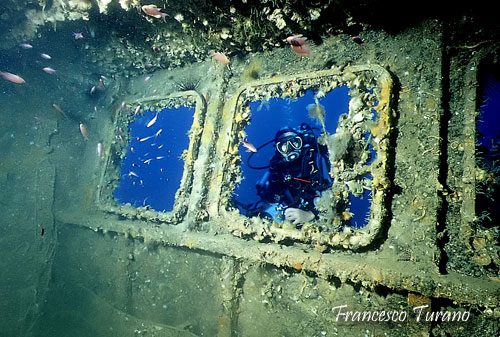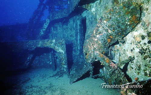 Seguendo gli spostamenti lenti degli scorfani, a volte provocati da azioni di lieve disturbo del subacqueo, si percorrono gradualmente i diversi angoli del relitto. Gli interni, pur non essendo agevolissimi, con le dovute attenzioni diventano in parte accessibili. Attraverso una porticina, che si trova alla base del cassero di poppa della nave, si raggiunge un camminatoio tramite il quale è possibile avvicinarsi a diverse aperture che permettono l’accesso ai locali di servizio della nave. Ma anche solo muovendoci all’esterno troveremo scorci interessanti: le stive contengono quel che rimane del carico, accumulato e ormai abbastanza sparpagliato; fissate alla paratia dei locali equipaggio, nel castello di prua, fanno bella mostra l’elica e l’ancora; spettacolari sono gli alberi e gli argani, coperti da una colorata e varia fauna incrostante, e suggestivi sono i verricelli di prua, sotto i quali si nascondono ancora una volta i simpatici scorfani.