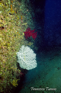 E se ci si spinge qualche metro più giù, dove la nave poggia sul fango, ecco ancora delle sorprese: qualche gorgonia (Paramuricea clavata) aderisce alle paratie e persino alla catena dell’ancora, con, fiore all’occhiello, una splendida Eunicella verrucosa, gorgonia di un bel bianco candido e specie solitamente rara.