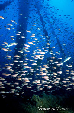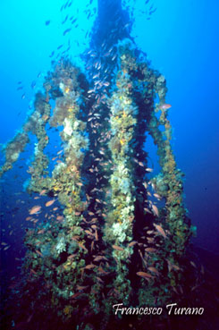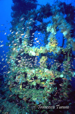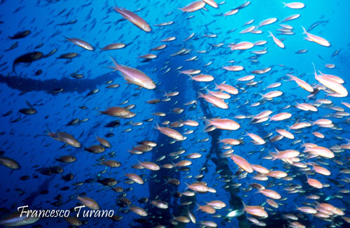 Planando a mezz’acqua prima di giungere in prossimità del fondo, vedremo gradualmente il trasformarsi dei tono blu/verdi del quadro generale dello scafo, visto dall’alto, in toni sempre più saturi e, alla luce del faro, scopriremo subito i primi incredibili colori. Cromatismi intensi e felici che, per quanto comuni a molti relitti e ricorrenti un po’ ovunque, sono sempre un biglietto da visita entusiasmante per un relitto. Parlo del colore di tutti quei piccoli pesciolini della famiglia dei serranidi che, con il loro delicatissimo rosa e l’eleganza delle loro forme, incorniciano quasi ogni tipo di struttura sommersa. La magia delle castagnole rosa si somma a quella di strutture dello scafo, come corrimano, alberi e bracci di gru, coperti a tappeto da tunicati e poriferi, in un tripudio di colori e forme bizzarre che nell’insieme ricorda la ricchezza di un mare tropicale…