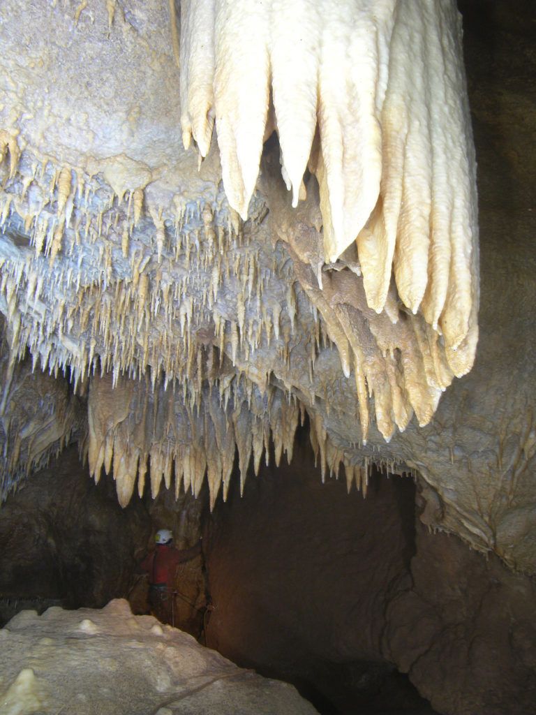 Raggiungiamo il fondo della grotta in tarda mattinata, i sacchi sono appesi ai tiranti della piattaforma che può ospitare solo me, Luca Pedrali e Mauro; mentre Nico e Luca sono appesi al traverso (stile “piccionaia”) e si occuperanno delle riprese video dall’alto.