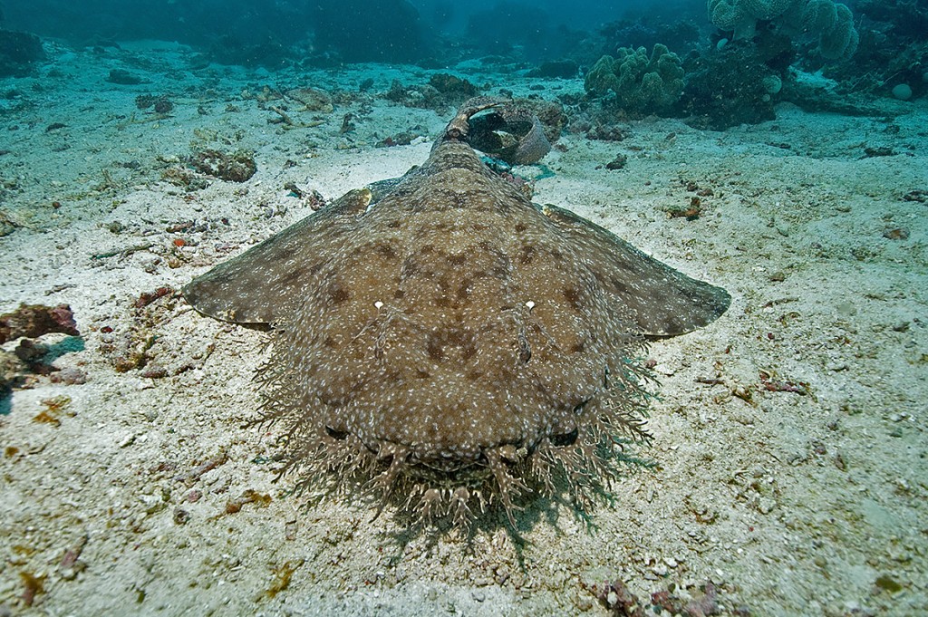 Lo squalo in particolare è uno squalo tappeto o wobbegong tassellato, Eucrossorhinus dasypogon, fotografato a Raja Ampat.