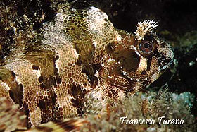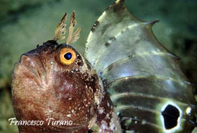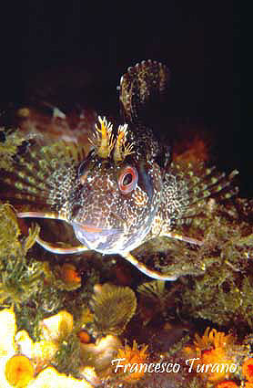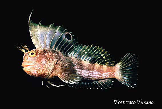 foto dx – Il possente capo della bavosa occhiuta:la temibile bocca, le grandi gote, gli occhi con i tentacoli a mò di corna e, sullo sfondo, la grande pinna dorsale con il finto occhio nero, da cui il nome di questa specie particolarissima.