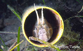 foto sx – Le lunga corna di questa bavosa, non a caso detta cornuta, sporgono da una curiosa dimora, costituita in questo caso dal relitto di un tubicino rigido.