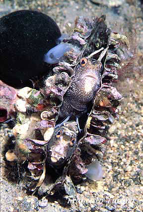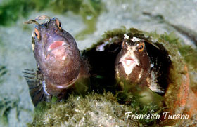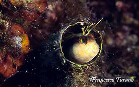 foto sx– Una situazione insolita vede questa coppia di bavose occhiute all’interno della conchiglia vuota di una pinna rudis. Il rifugio è stato scelto accuratamente per la deposizione delle uova, protette tenacemente dal maschio.