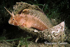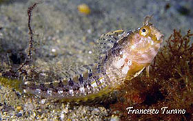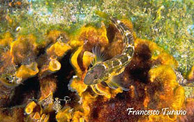foto sx – Il sinuoso corpicino della bavosa cornuta e la caratteristica livrea marezzata e adatta a un perfetto mimetismo.