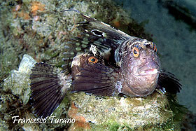 foto sx – La bavosa cervina inarca il dorso e solleva il capo verso l’alto, puntando le pinne ventrali sul fondo in un’altra caratteristica posizione dei blennidi.