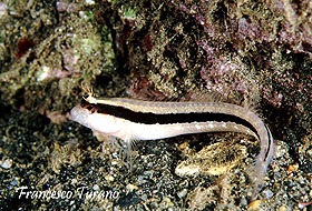 La candida livrea di una bavosa bianca, con la caratteristica striscia nera lungo il fianco.