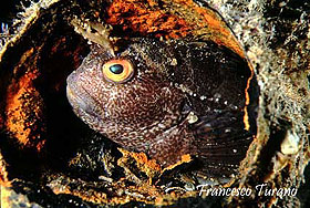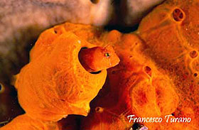 foto dx – La bavosa rossa affacciata all’uscio di casa. Il suo colore si confonde con quello della spugna che ricopre la roccia e il mimetismo e così perfetto.