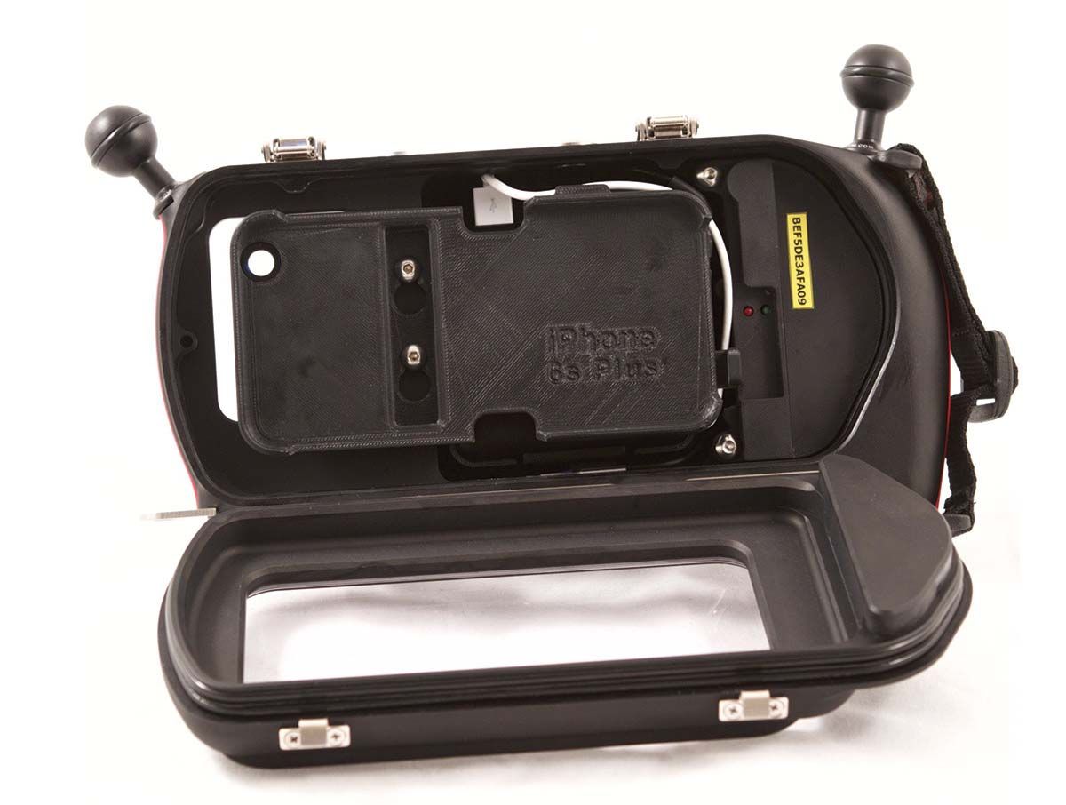 Il telefonino si posiziona comodamente in una cover disegnata su misura per ogni modello, e per la verità si connette (con un solo cavetto) a un pacco batteria da 10 Ah, che garantisce che l’apparecchio, nonostante l’uso intenso, non si scarichi e supporta l’elettronica della custodia. Al contrario lo smartphone si ricarica, e a fine immersione possiamo ricominciare a usarlo come telefono. L’autonomia dichiarata è di 10 ore se partiamo con la batteria completamente carica.