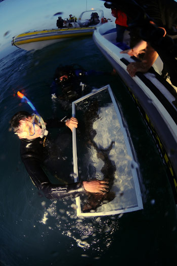 L’imbarcazione, con a bordo 3 esemplari di “gattopardo” maschio e i biologi, scortata dalla barca della Guardia di Finanza, si è fermata ad una distanza di circa 8 chilometri dalla riva, in un’area ritenuta ottimale per la riproduzione ma soprattutto dove è vietata la pesca.