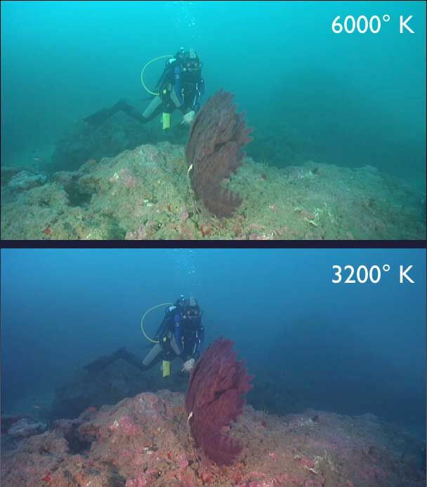 Durante il giorno sott’acqua la temperatura colore è sopra i 7000 ° K con una dominante azzurra, di conseguenza dobbiamo scegliere un kit d’illuminazione con una temperatura colore che mi permetta di far risaltare i soggetti, è proprio l’equilibrio tra luce ambiente e luce artificiale che farà la differenza nelle nostre riprese subacquee.