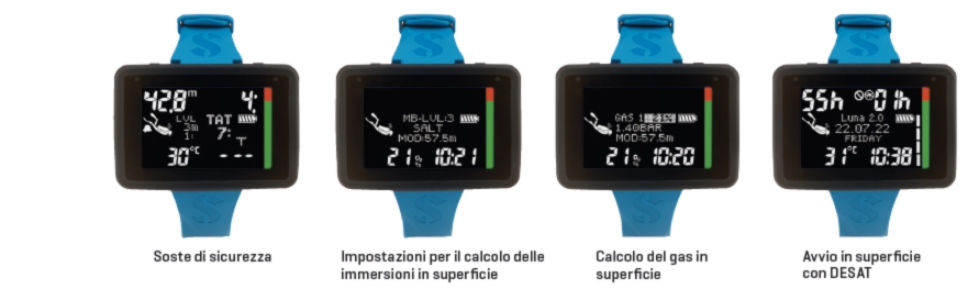 - MOLTEPLICI MODALITÀ DI IMMERSIONE: scelta tra 2 algoritmi: Algoritmo predittivo Multi-Gas Bühlmann ZH-L16 ADT MB PMG o algoritmo ZH-L16+GF (fattore di gradiente). Compatibile con nitrox (100%) con 3 diversi gas. Tre modalità di immersione: Scuba, Gauge e Apnea.