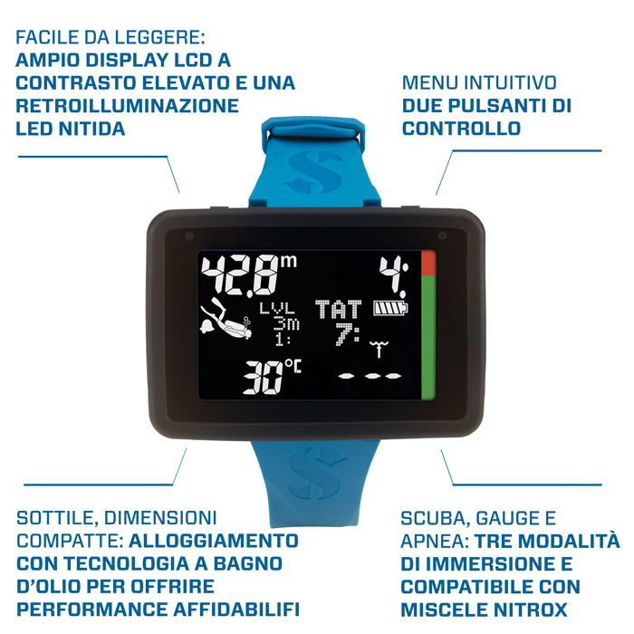 Sono disponibili tre modalità subacquee (Scuba, Apnea e Gauge), delle soste intermedie basate sul profilo di immersione (Profile Dependent Intermediate Stops – PDIS) e la possibilità di selezionare sei livelli di microbolle.