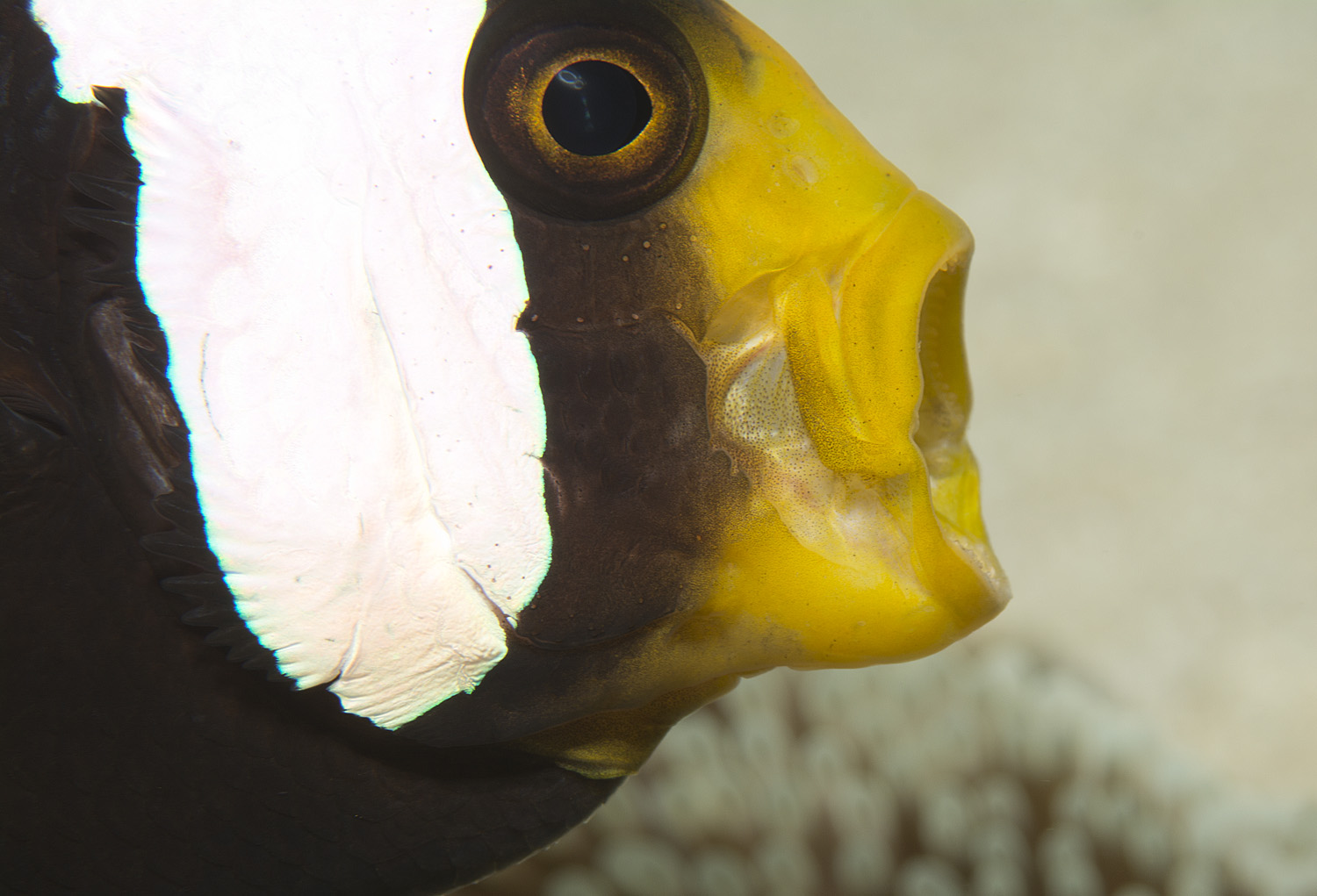 Il pesce pagliaccio, Amphiprion polymnus, spalanca la bocca in uno sbadiglio esagerato proprio mentre lo sto inquadrando in close-up, da distanza ravvicinata.
