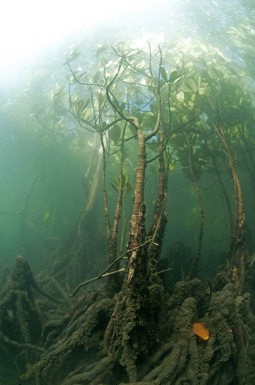 Alberi che hanno caratteristiche biologiche eccezionali: intanto sono in grado di vivere assorbendo acqua di mare, ed eliminando i sali in eccesso attraverso ghiandole poste sulle foglie. Le loro radici formano strutture dette pneumatofore che hanno lo scopo di permettere la respirazione anche a questo livello. Le radici infatti ancorano la pianta penetrando in un fondale fangoso molto compatto, che dopo i primi centimetri diventa anossico (privo di ossigeno): ma le radici per vivere hanno bisogno di ossigeno, e lo ottengono tramite le pneumatofore, che sporgono nell’ambiente acquatico o aereo (secondo la fase di marea), come sporgenze dal fondo o come formazioni a trampoli. La foresta a mangrovie è un ambiente di grandissima importanza, che ospita e permette lo sviluppo di forme giovanili che in seguito migreranno sul reef vicino, protegge il reef filtrando e trattenendo il sedimento trasportato dai fiumi, che potrebbe danneggiare i coralli. Lo snorkeling nelle mangrovie, con la guida giusta, è un’esperienza estremamente istruttiva e leggermente psichedelica… a parte il fatto di nuotare tra alberi ad alto fusto, in uno scenario simile a quelli dove di solito andremmo a cercare funghi, il numero di specie animali strane e caratteristiche che possiamo vedere è eccezionale. Dai granchi che corrono sui tronchi, ai nudibranchi e i vermi piatti, a manicotti di spugne che avvolgono le radici, ai pesci che si muovono in un ambiente protetto e ricchissimo.