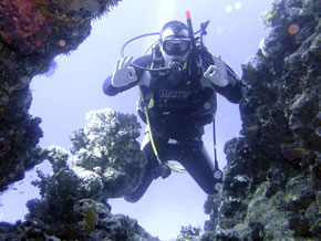 Dopo le sofferenze della prima immersione decidiamo di rinunciare al bis ad Elphistone per spostarci in un posto più riparato: Abuda Dabab Lagoon conosciuta anche come Haven One, dal nome del relitto di uno yacht che giace sul fondale sabbioso di 20 metri. E qui davvero abbiamo una bellissima sorpresa: una serie di grotte, anfratti e passaggi tra le rocce rendono suggestiva quella che forse considero la più bella immersione di Marsa Alam.