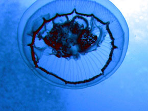 La partenza per Elphistone preannuncia una giornata impegnativa. Sveglia alle 5.00 per un’ora di pullman e quasi tre di barca. A preoccupare non sono tanto le ore in barca ma le condizioni del mare che non perdona gli stomaci più deboli: la barca si è spesso messa “a candela” tra le onde di un Mar Rosso mai visto (2-3 mt di onda) incattivito dal forte vento (valutabile intorno ai 30-40 Nodi). Raggiunta la meta la barca ci porta in mare aperto all’inizio del reef (che è un ellissoide che si solleva dalle profondità, si dice che la parete sprofondi ad oltre 100 mt). E’ una Drift Dive (un’immersione in corrente), ma che corrente! Dopo 15 minuti pronti per entrare in acqua, in piedi sulla plancia di poppa tra le onde che ancora creano parecchi problemi di chinetosi a molti di noi, finalmente ci si tuffa e subito siamo premiati per la vista di un paio squali di barriera che non riusciamo ad avvicinare a causa della corrente. Ci lasciamo trasportare ma per pochi metri perchè scendendo in profondità (-30mt) il gioco cambia e dobbiamo nuotare controcorrente per parecchio tempo con consumi di aria esagerati. La parete è molto colorata e viva ma sia per il “casino” iniziale che per la forte corrente non riusciamo a godercela come vorremmo. Dulcis in fundo, siamo costretti a riemergere dopo appena 30 minuti (causa fine aria) tra centinaia di meduse, fortunatamente non urticanti, che ci tengono compagnia fino all’arrivo del gommone che ci viene a recuperare molto lontano dalla barca.
