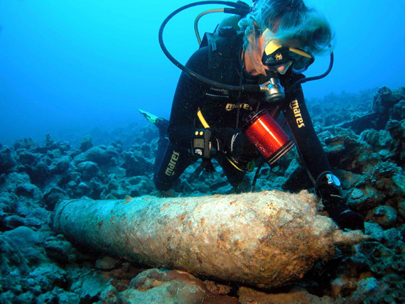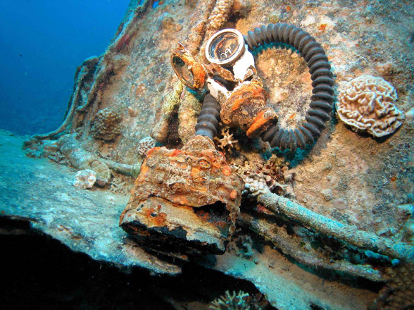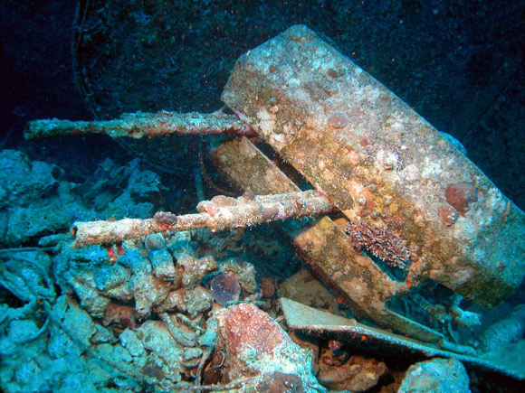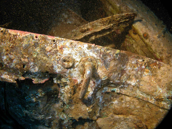 La concrezione di soli trent’anni di acqua salata rende facilmente riconoscibili gli oggetti ora in parte schiacciati dalla pesantezza della chiglia.