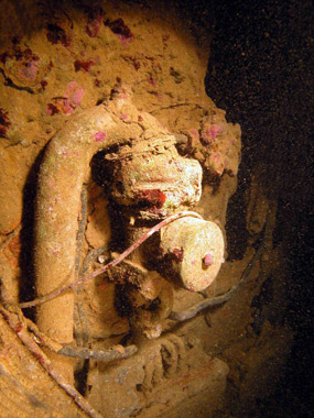 Nel ritornare vicino al corpo centrale effettuiamo un ultima fermata su una bombola , forse di CO2, con a tutto oggi riconoscibile la manopola di apertura del rubinetto; a nulla però è servita quando a bordo è scoppiato l’inferno.