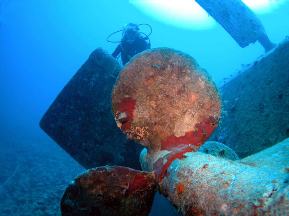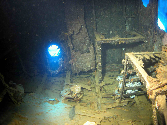 Siamo nella parte poppiera , dove i due grossi timoni sovrastano la lamiera altrementi piatta e dove una delle eliche è illuminata dalla luce naturale del sole. Mi avvicino alla lamiera e noto una discreta apertura , forse causata da un’esplosione dopo l’attacco che dimostra la lacerazione dello scafo che ne causò il tramonto.