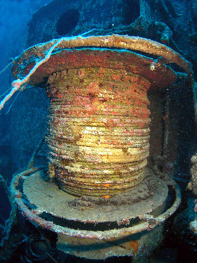 Abbandoniamo il ponte comando e ci avviciniamo a prua , dove nell’ancora di dritta ancora al proprio posto , hanno trovato il loro habitat una piccola famiglia di ricci; mentre quella di sinistra è alla fonda e sulla catena che la tiene legata alla nave un immenso numero di alcionari e spugne di svariati colori hanno cercato di nasconderla per sempre e tagliare il suo legame con il mondo terrestre.